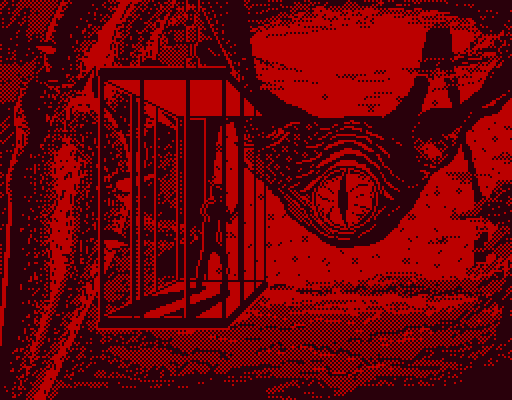 You wake up in the dark, the air is thick and smells of rust. You're on the ground, so you push yourself up. Getting up to your feet, you see metal dust on your hands and look around, noticing a red glow illuminating the foggy void around you. In the distance, the sound of drums comes rolling across the waves of red mist. The rhythmic boom grows louder, more intense. You start to feel the wind pick up behind you and the red light growing more intense. You turn around, finding yourself staring into an otherworldly horror through metal bars.